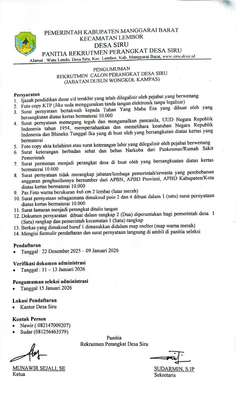 - Pengumuman Rekrutmen Calon Perangkat Desa Siru